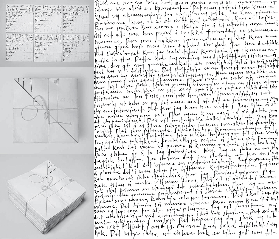 Nedtegnet Tilnærming av og til et VERK. Foldet Dokument. # Tor Ulven # 37+1 foldete ark, signert og bundet, tom sumi flaske, brukt kalligrafi fjær; alt lagt i en papirpose for epler og overlevert Theodor Barth / KHiO 25.9.2017 19:29. Straffeskrift.