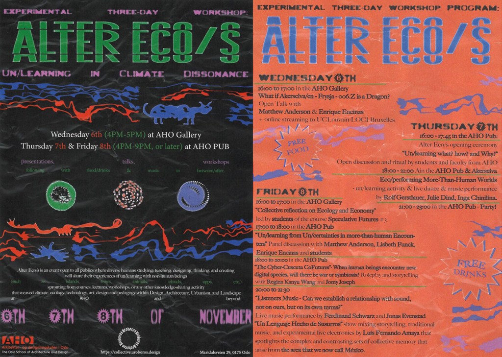 Online screenings of Weird From Iceland, Quo Vadis Nomen Nesio (2035, 11’35”) and the documentary of our multimedia live-ecoperformance Weird’s Tale – There Will Come Soft Rains (2024, 50’38”) at the Alter Eco/s : Un/Learning in Climate Dissonance segment Eco/performing More-Than-Human Worlds, Thursday November 7th 18:00-21:00 @ the AHO Pub & Akerselva. The screening was followed by artist talks and an Akerselva (Akers river) un/learning activity/performance for guests, students and faculty of The Oslo School of Architecture and Design (AHO).